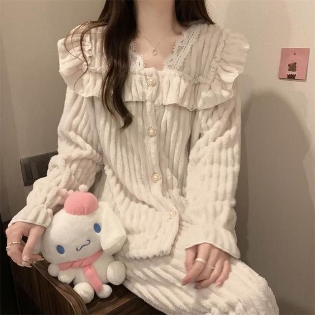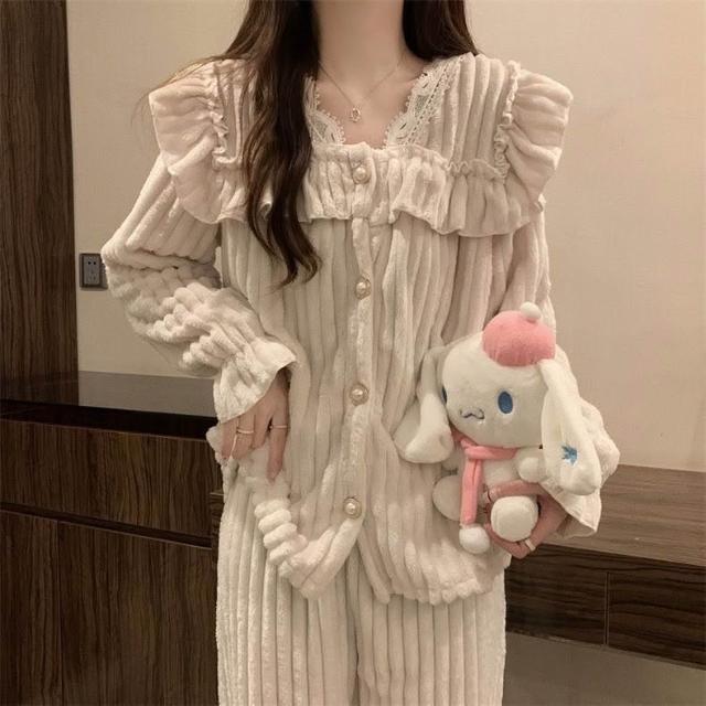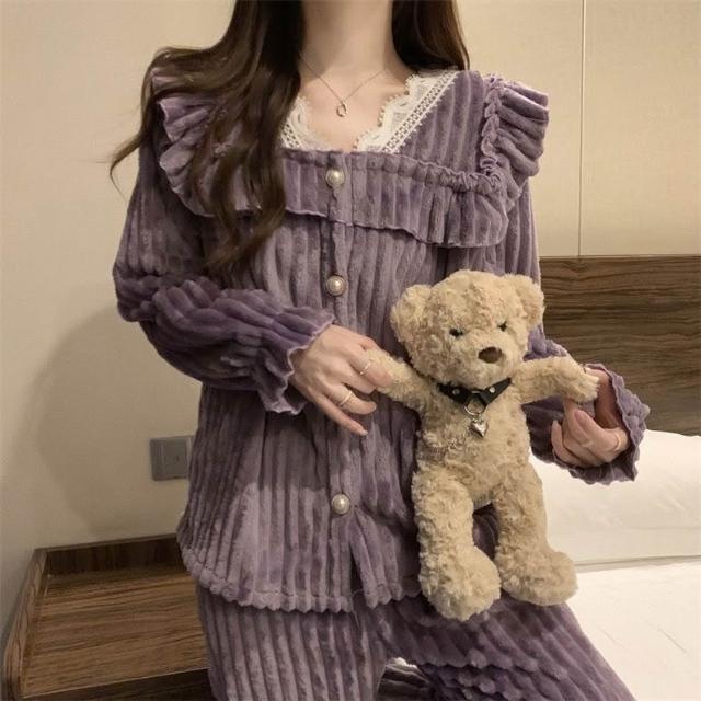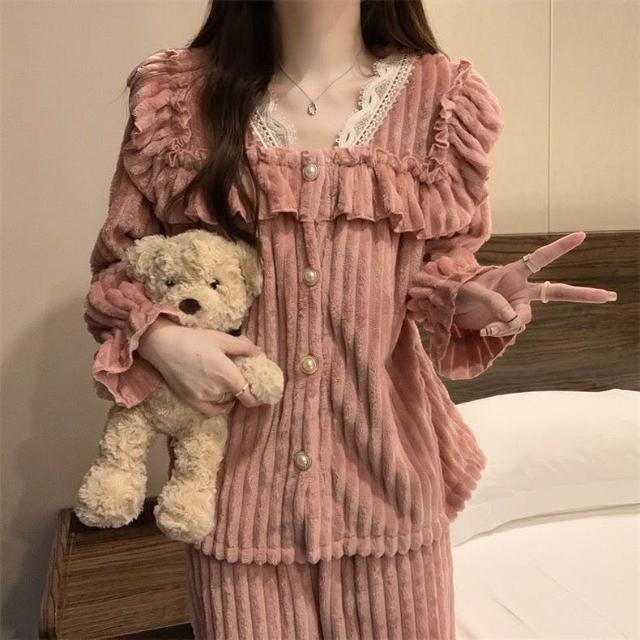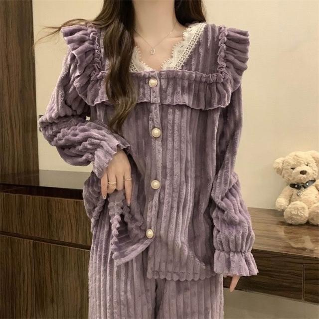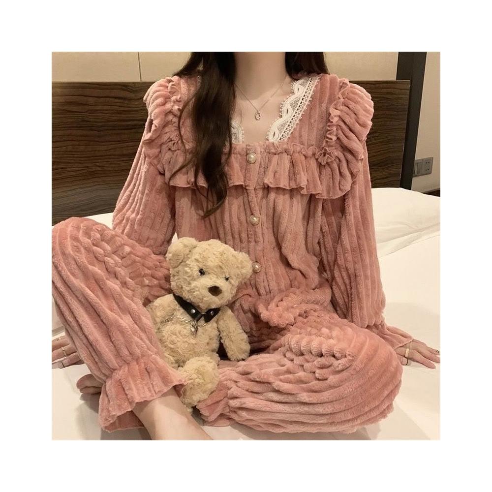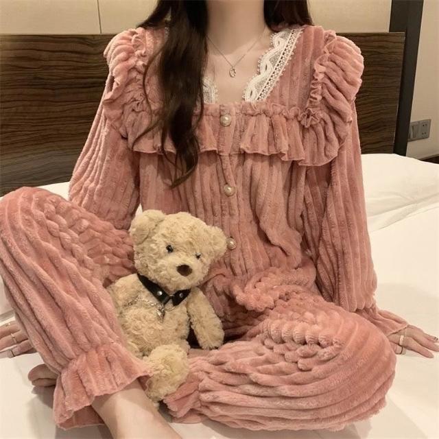 冬季居家服睡衣 珊瑚絨睡衣女 公主風蕾絲睡衣 法蘭絨冬季睡衣兩件套 睡衣套裝 加絨加厚 毛絨睡衣 保暖 睡衣
