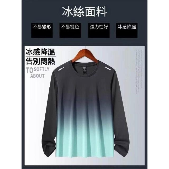 男士長袖運動訓練跑步涼感漸層印花T恤 大碼M-5XL 健身衣服 運動上衣 速乾透氣 長袖排汗衫 晨跑防曬騎行服