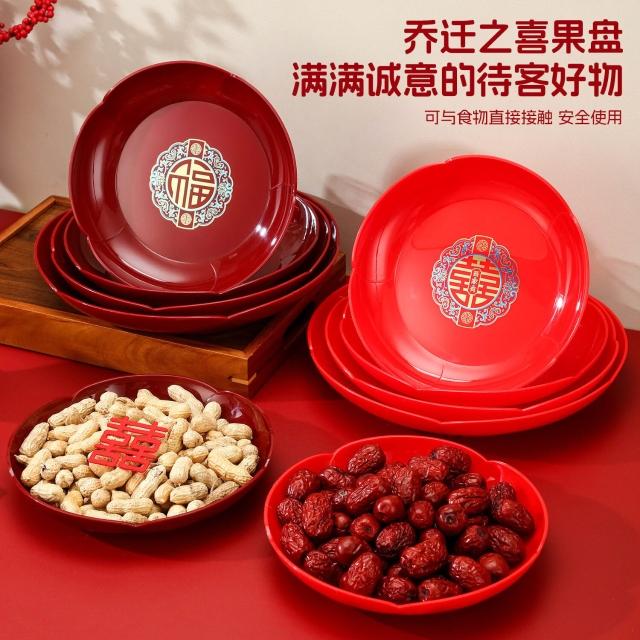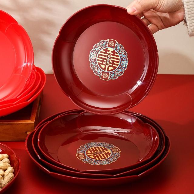 喜盤梅花瓣 加大加厚新年紅盤 果盤 多規格供盤 囍糖收納盒 訂婚幹果盤