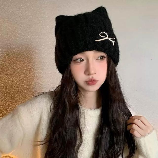 🔥蝴蝶結貓耳帽🔥 HN38 韓版秋冬新款帽子女可針織毛線帽冬季保暖 尖尖帽 冬帽 情侶帽 韓版針織毛帽 素面毛帽 瓜