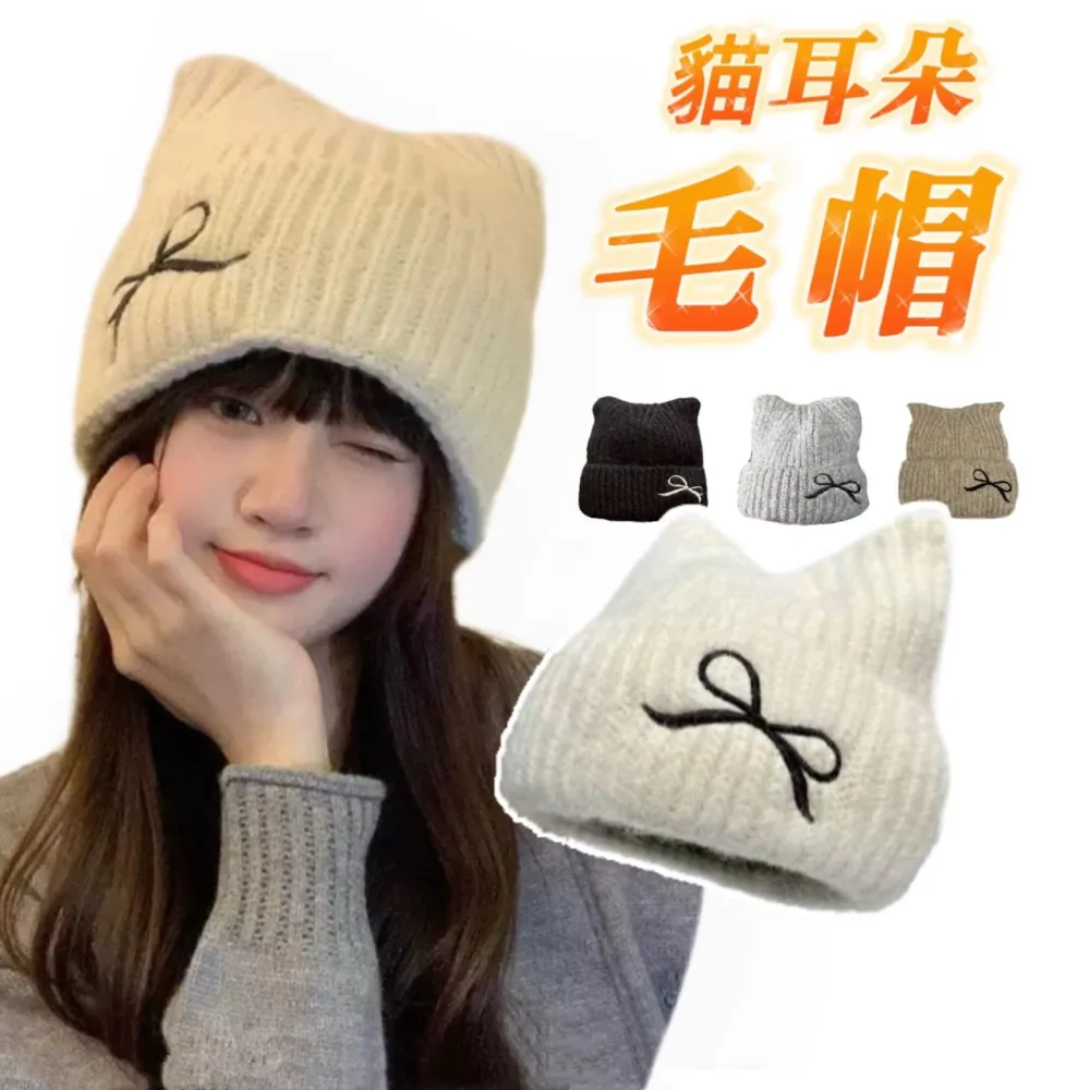 🔥蝴蝶結貓耳帽🔥 HN38 韓版秋冬新款帽子女可針織毛線帽冬季保暖 尖尖帽 冬帽 情侶帽 韓版針織毛帽 素面毛帽 瓜