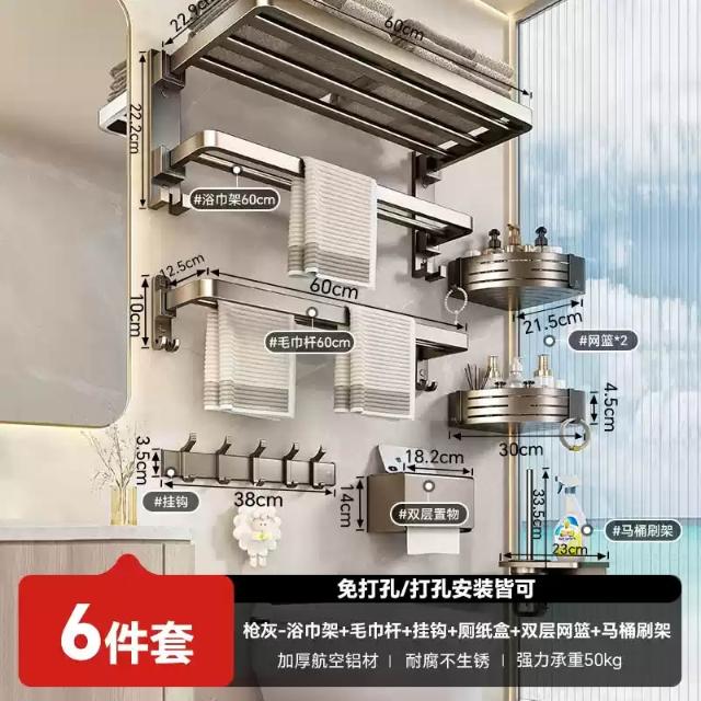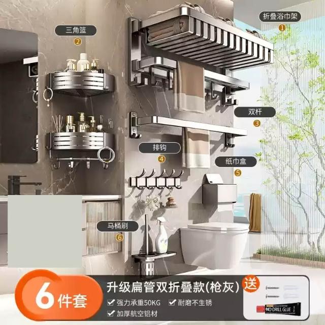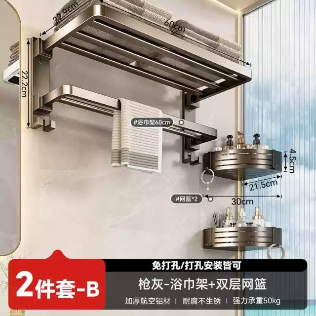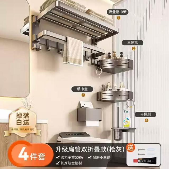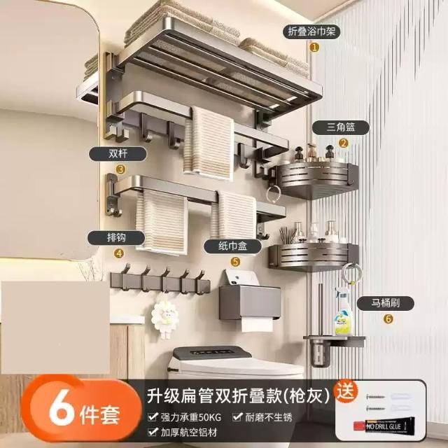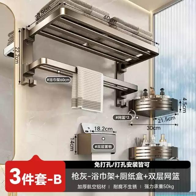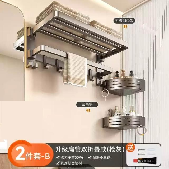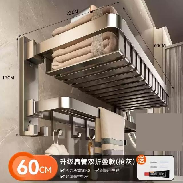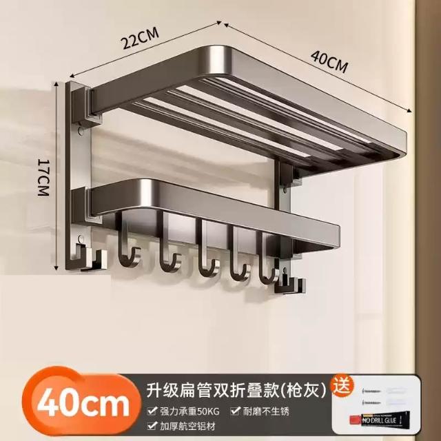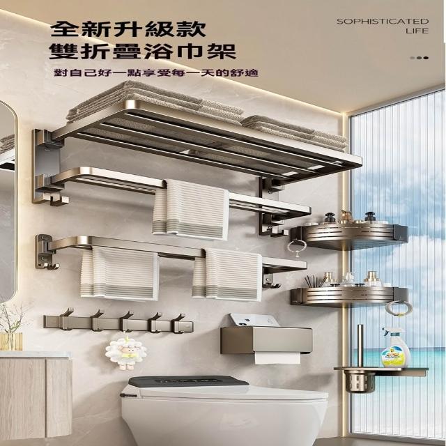 赫朗 浴巾架一體掛架 浴室毛巾置物架 毛巾架 階梯式雙桿 加寬扁管設計 可左右移動(90°雙折疊/承重50kg/上下雙鉤)