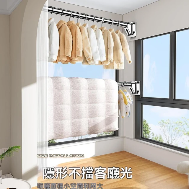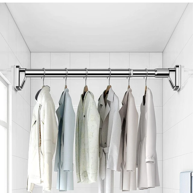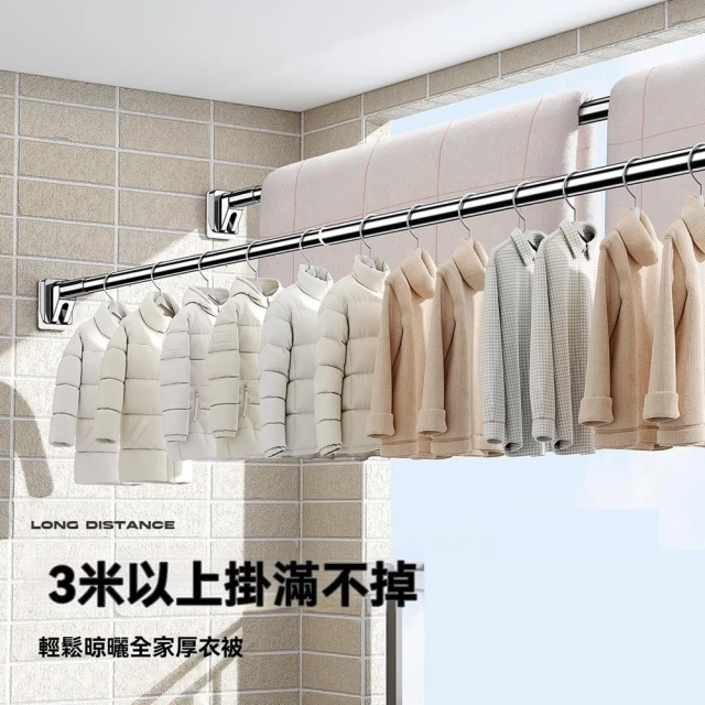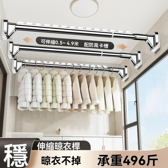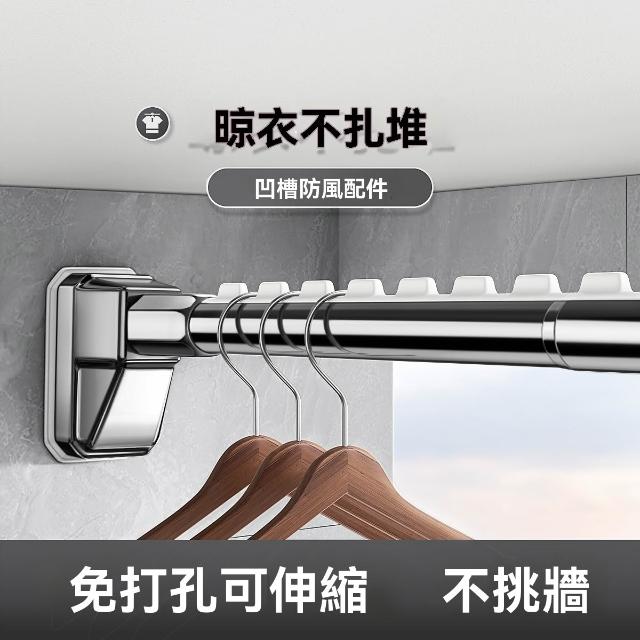 赫朗 不鏽鋼伸縮晾衣桿 晾衣桿 伸縮曬衣桿 壁掛桿 曬衣架 掛衣架 壁掛曬衣桿(伸縮0.7-4.9米/帶防風槽/牢固不掉)