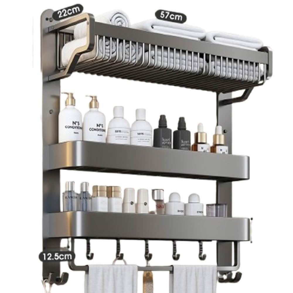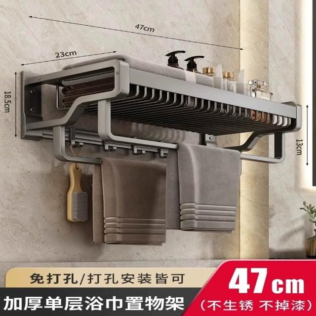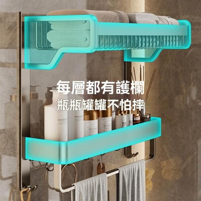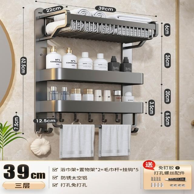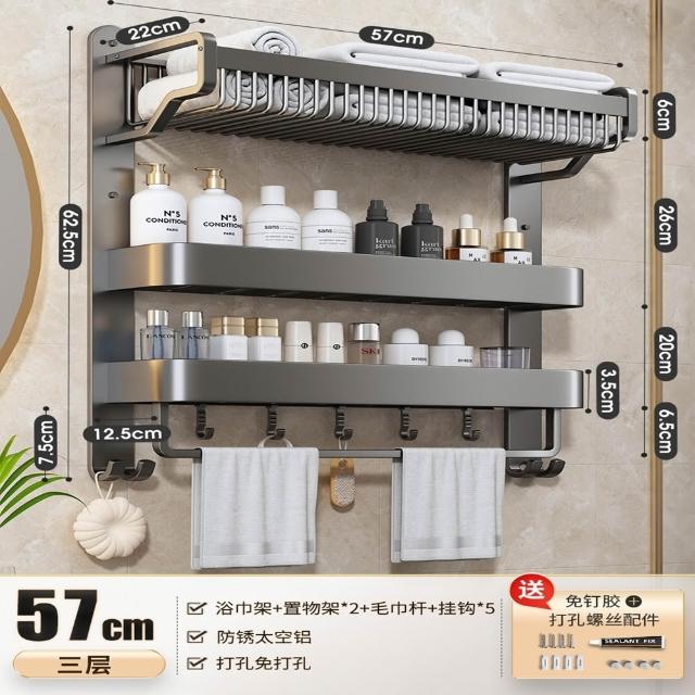 赫朗 一體浴巾架免打孔 毛巾架 浴巾架 浴室收納架 浴室毛巾置物架 太空鋁 (免打孔/雙層/三層37-57cm帶毛巾桿)