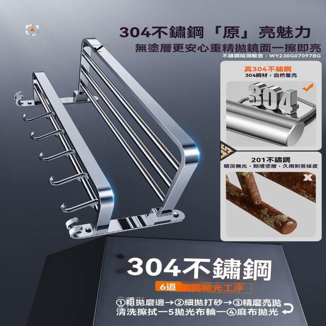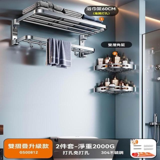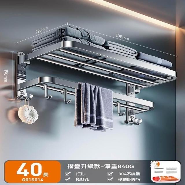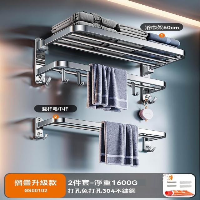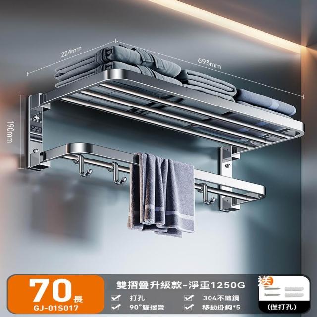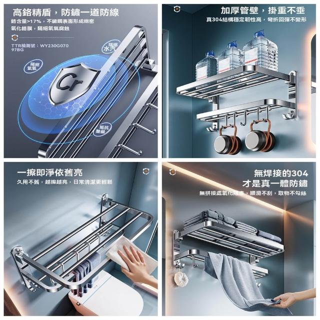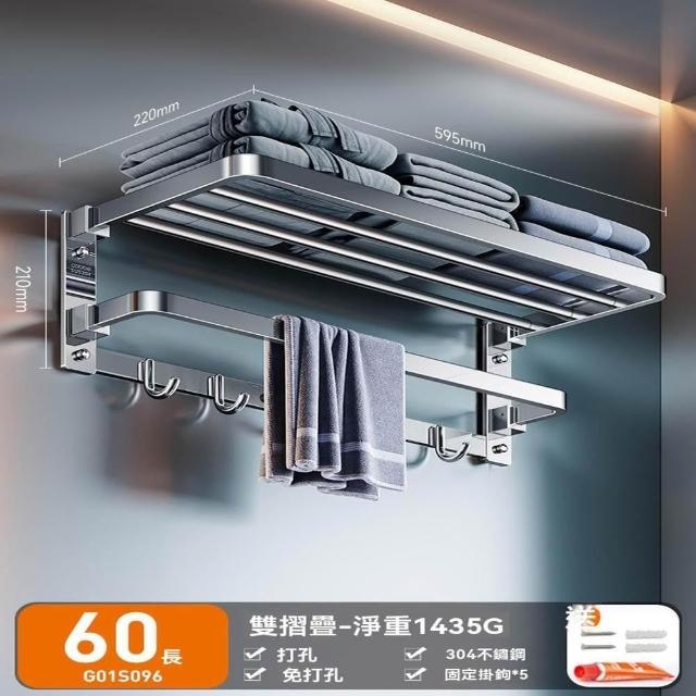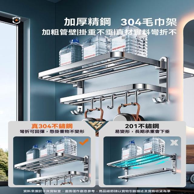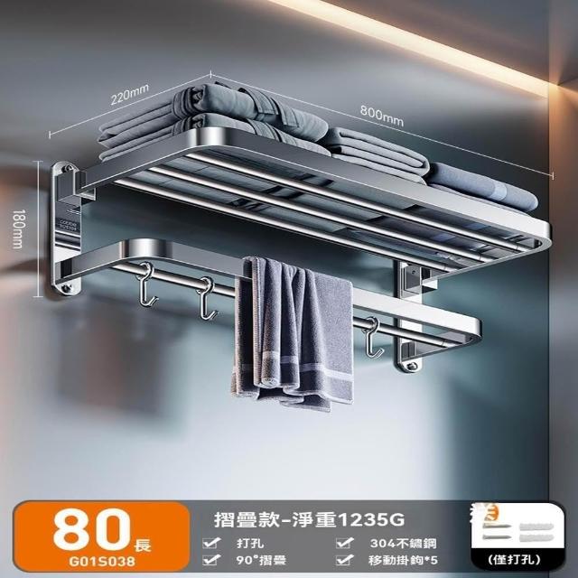赫朗 毛巾架 不鏽鋼浴室置物架 免打孔浴巾架 加厚管壁 耐腐不鏽 無塗層(304不鏽鋼/90度雙折疊/一體防銹)