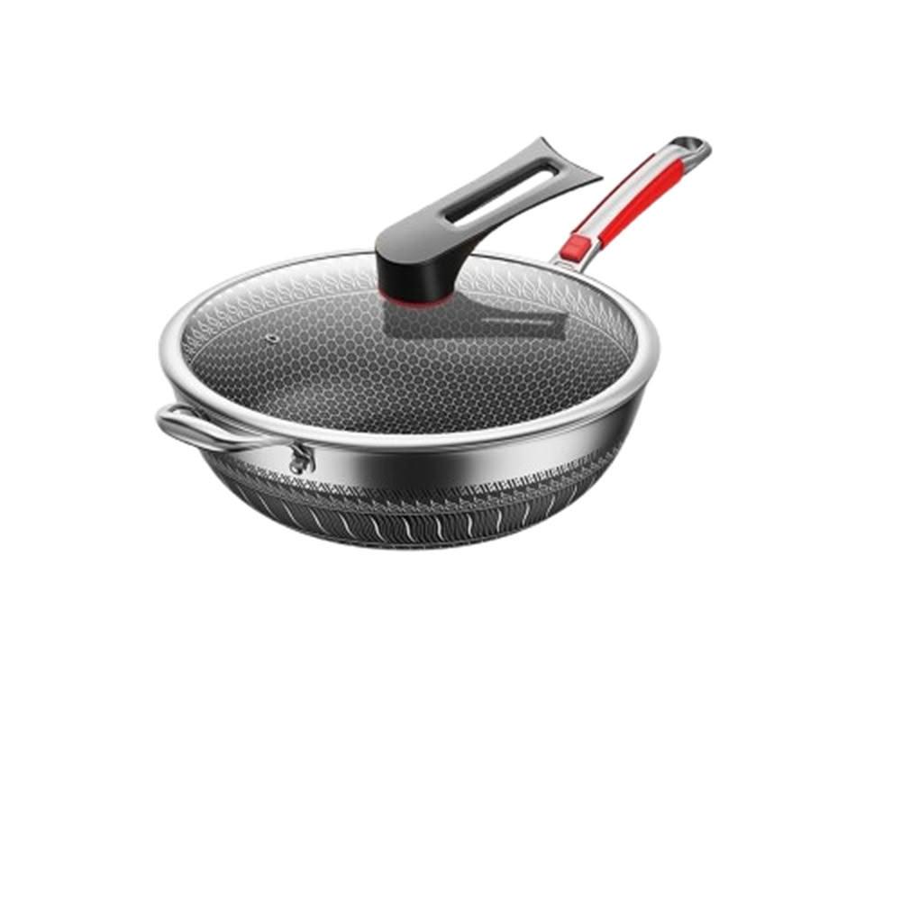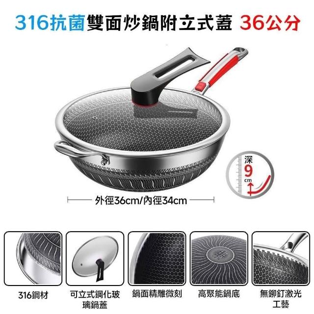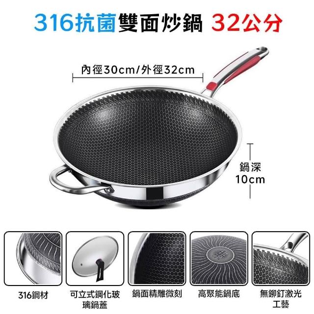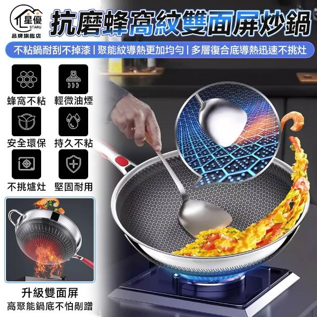 炒鍋 316不鏽鋼蜂窩紋炒鍋 不沾鍋 雙面蜂巢設計高效聚能 耐刮/耐熱/強磁【送鍋鏟/全鋼柄設計】