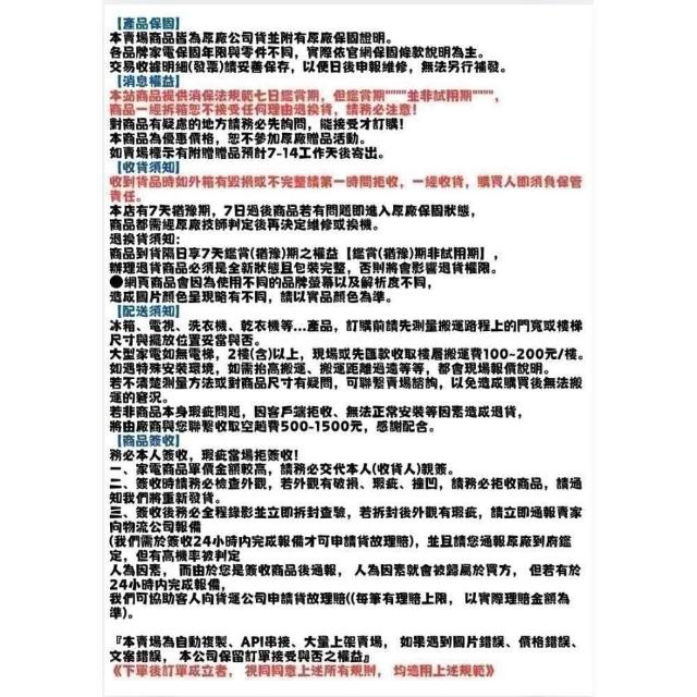 - 針對大型商品(包括:大型家電、家具床墊、健身按摩器材、車類...等),商店將於完成收款確認後,一天內〈不含例假日〉將會有專人與您確認相關配送細節等的聯繫。偏遠地區、樓層費及其它加價費用,皆由商店於約定配送時一併告知,商店將保留出貨與否的權利。