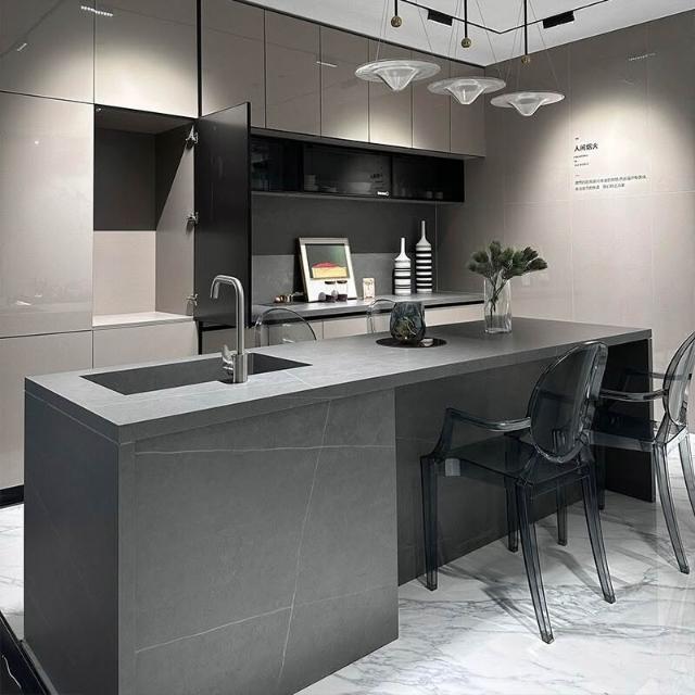 意式輕奢齊平款島臺餐桌一體純黑色吧臺高端巖闆餐桌中島臺帶水槽