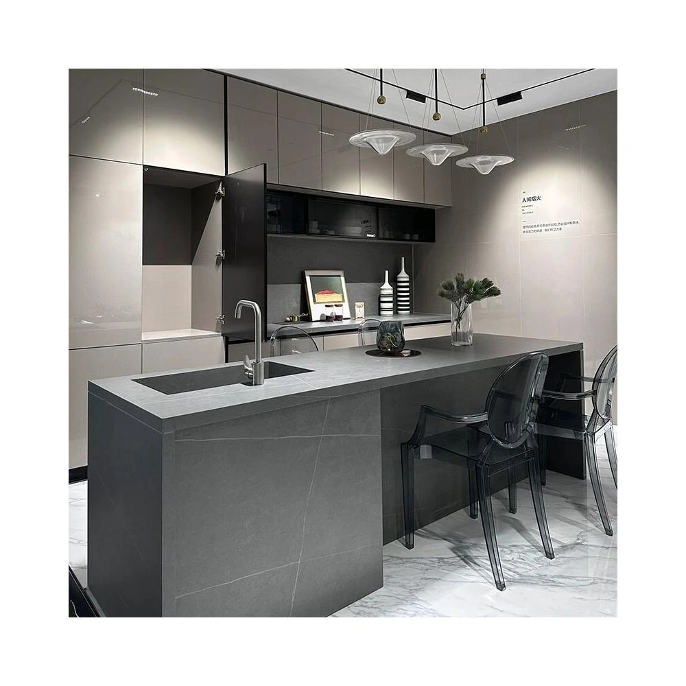 意式輕奢齊平款島臺餐桌一體純黑色吧臺高端巖闆餐桌中島臺帶水槽