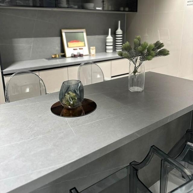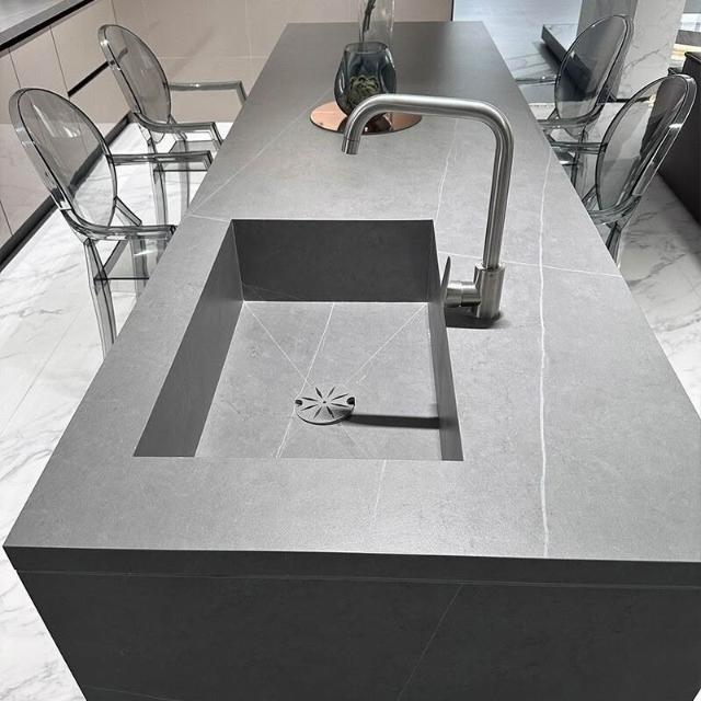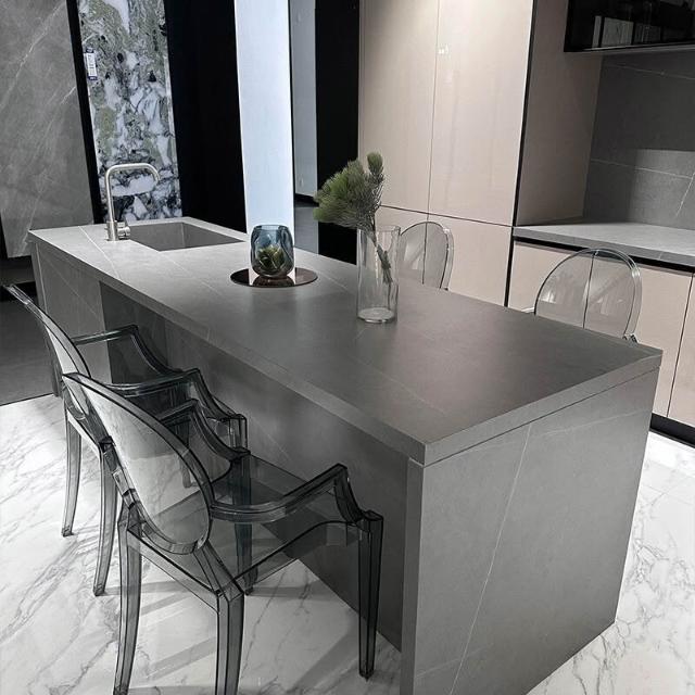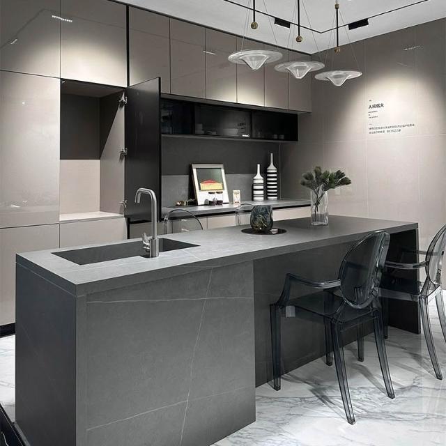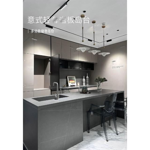 意式輕奢齊平款島臺餐桌一體純黑色吧臺高端巖闆餐桌中島臺帶水槽