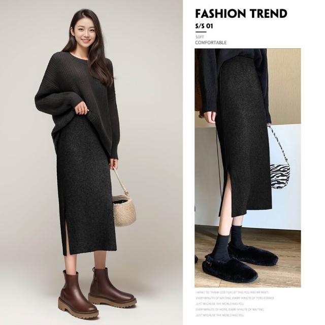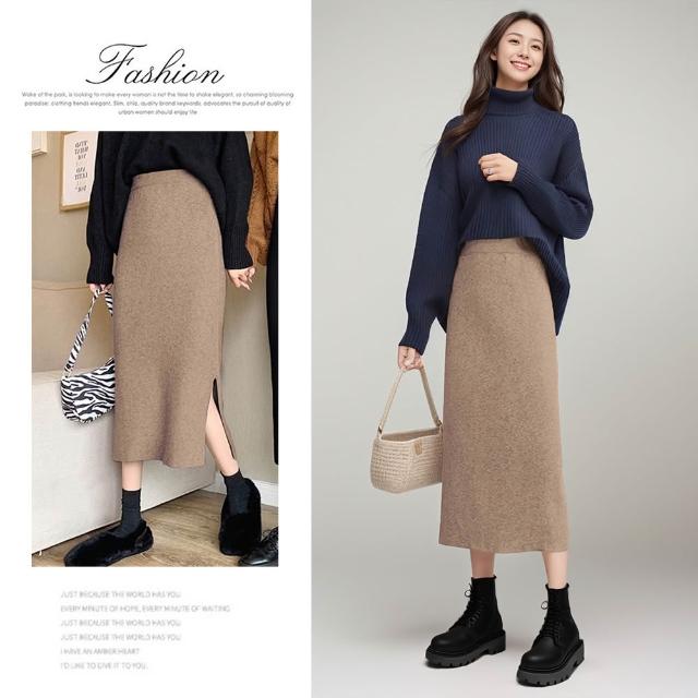 AMONE秋冬開衩針織包臀裙 針織長裙 針織裙 針織半身裙 高彈性 開衩長裙 顯瘦長裙 裙子 包臀裙