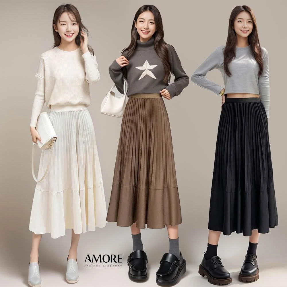 Amore韓版顯瘦百褶裙 高腰半身裙 百摺裙 大尺碼長裙 百褶長裙 裙子 a字長裙 顯瘦長裙 黑長裙 女裝