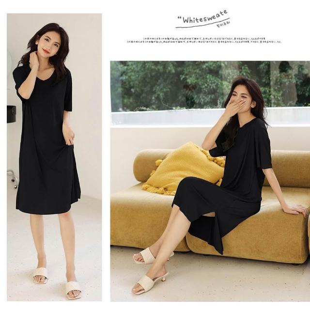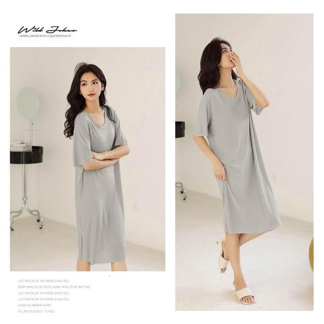 Amore夏季冰絲涼感衣 冰絲睡衣 V領上衣 涼感睡衣 舒適居家服 連身裙 長版睡衣 長版上衣 女裝5色
