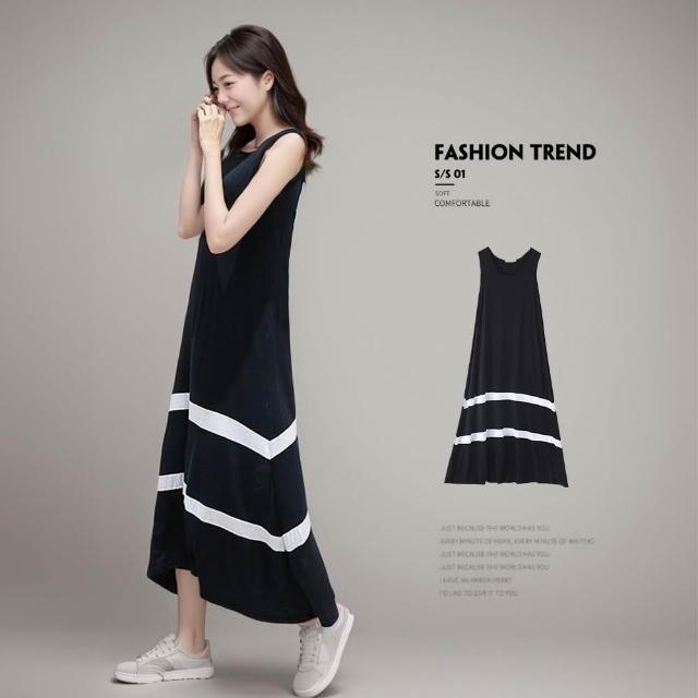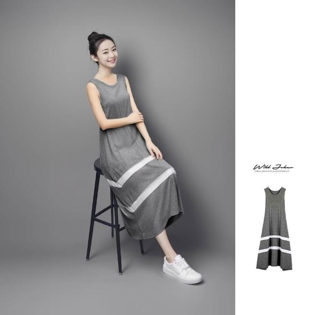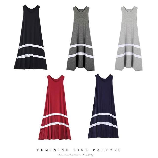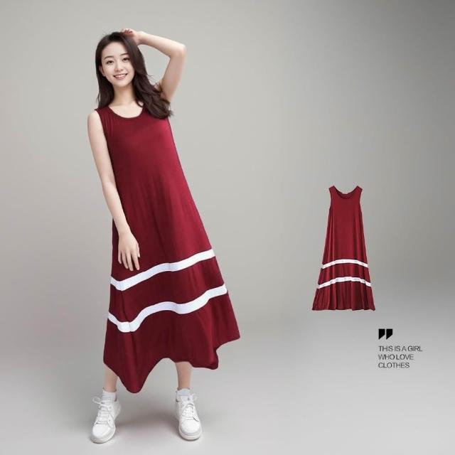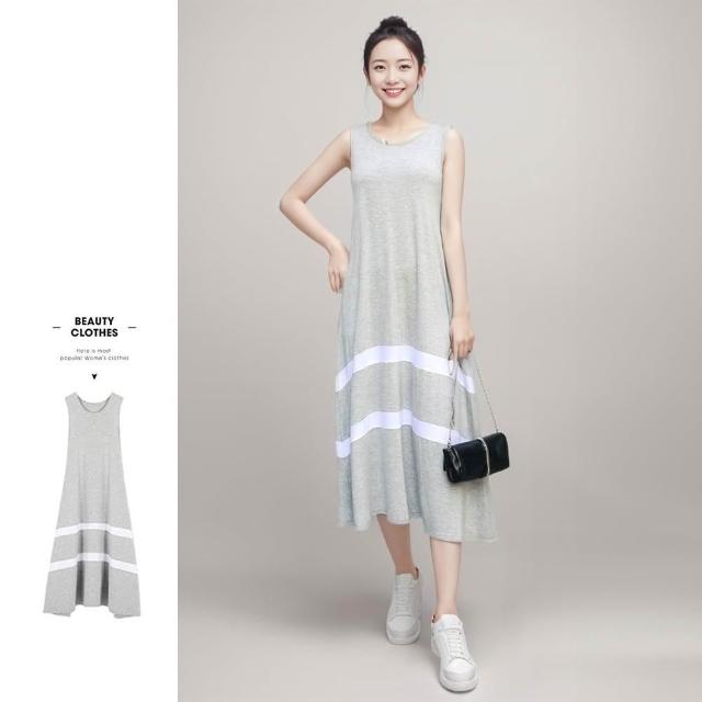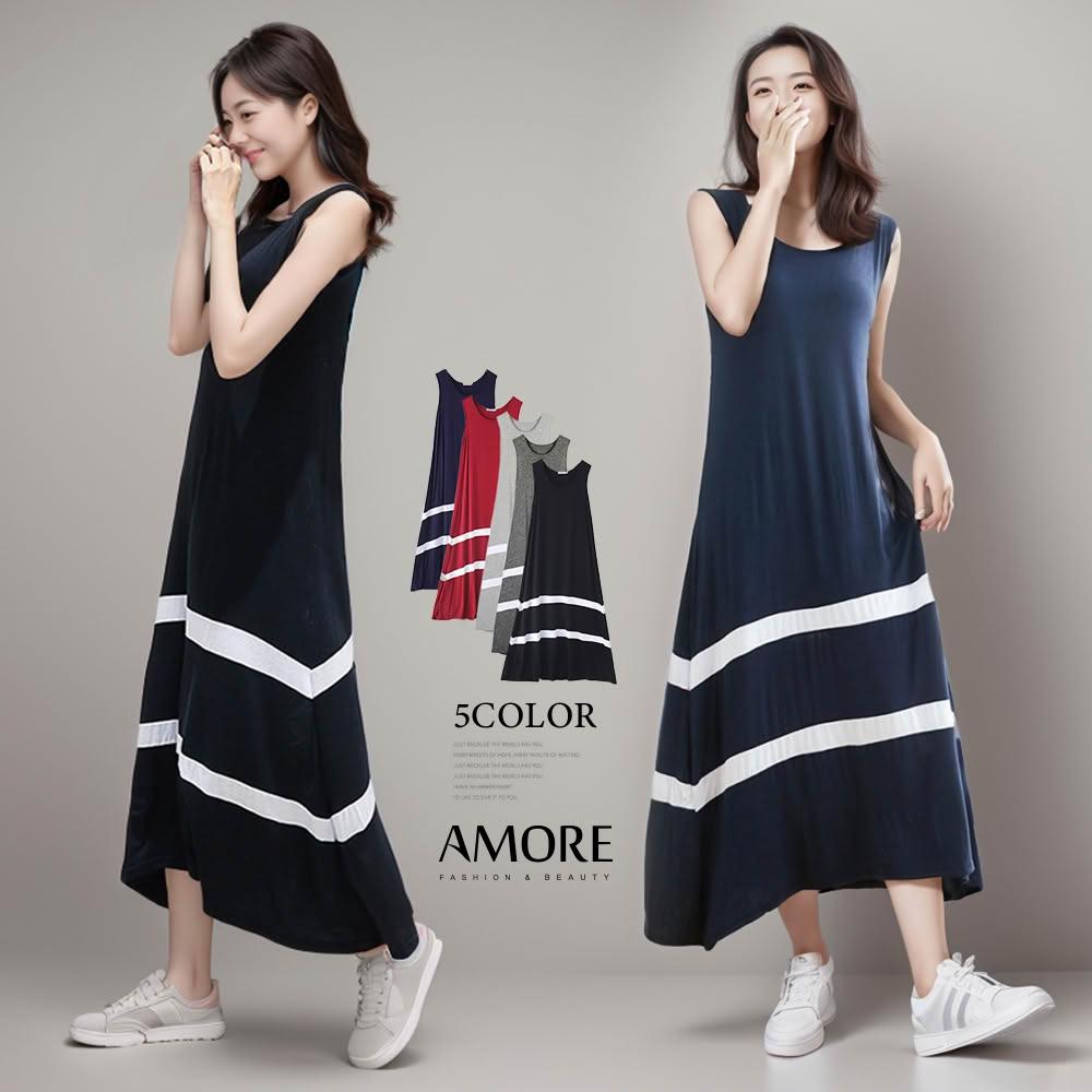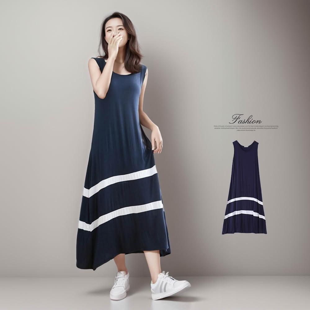 Amore莫代爾圓領背心橫條連身裙 無袖上衣 無袖洋裝