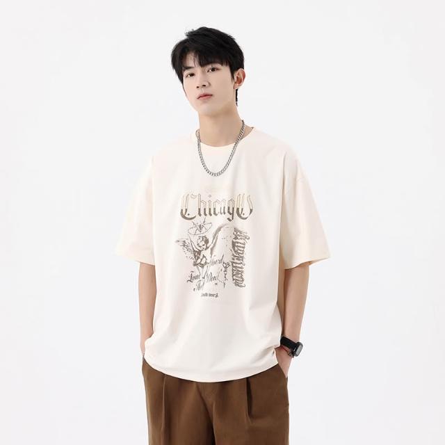 短袖T恤男 顯瘦寬鬆落肩五分袖上衣 男生衣服 夏季薄款透氣 落肩短T 短袖上衣 男生上衣短袖 短T男生短袖 印花T恤 百搭圓領