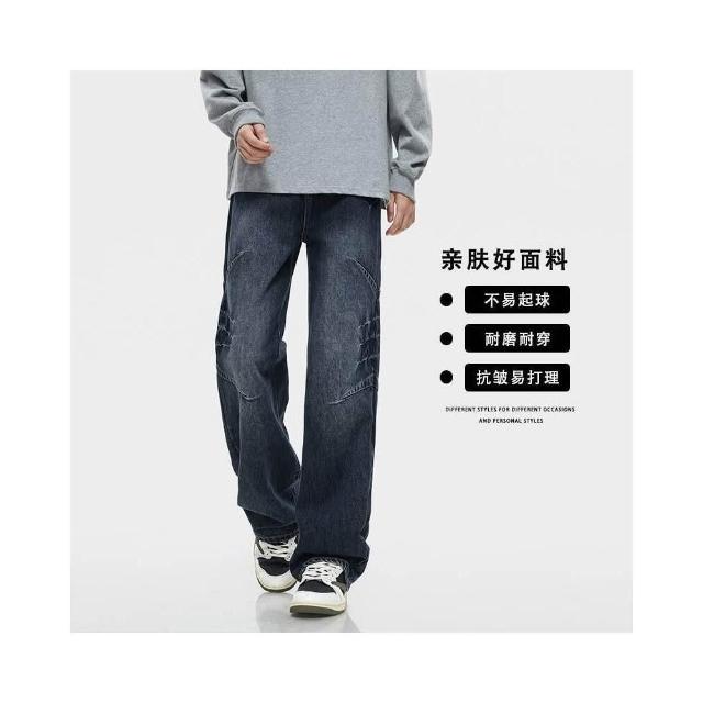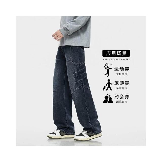 拼接牛仔褲男秋季闊腿垂感寬松直筒褲子痞帥百搭長褲小眾設計感美式高街牛仔休閑褲寬褲大尺碼薄款休閒褲耐磨登山褲垂感韓國彎刀褲