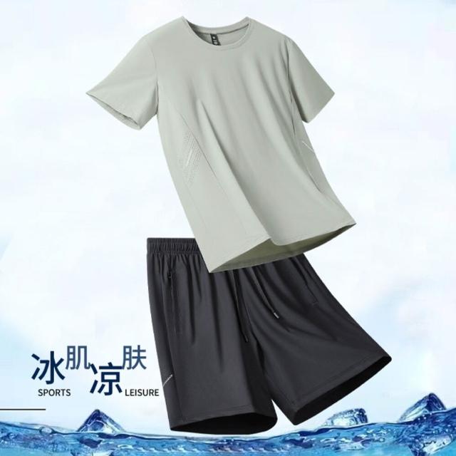 短袖運動套裝男夏季涼感冰絲舒適柔軟運動短褲輕薄透氣清涼短袖T恤大尺碼吸濕排汗彈力速乾衣休閒短袖上衣冰絲短褲涼感褲涼感衣