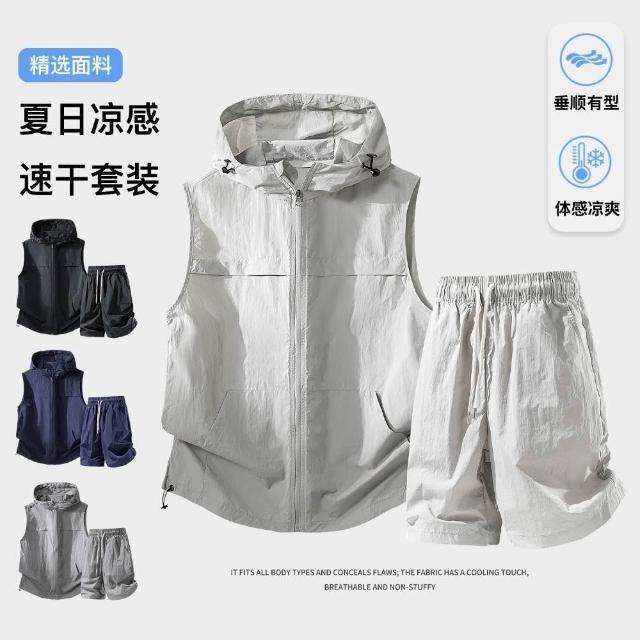 運動套裝男連帽背心輕薄透氣寬鬆套裝五分短褲夏天百搭休閒套裝吸濕排汗無袖背心短袖T恤運動短褲男裝戶外登山釣魚垂順速乾套裝男