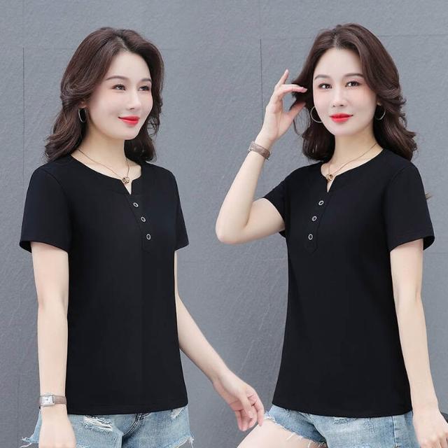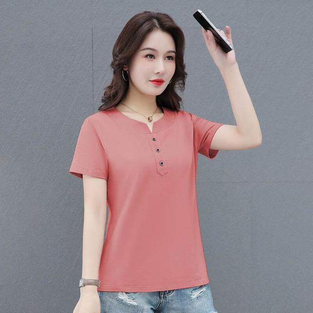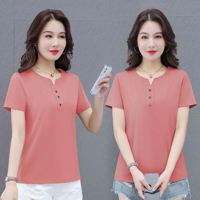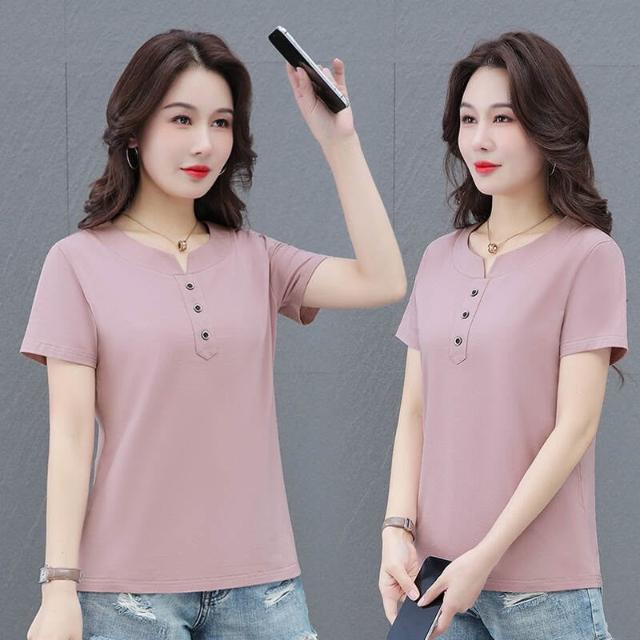 短袖夏季短袖上衣女韓國休閒V領短袖上衣洋裝紐扣短袖T恤輕量透氣吸濕排汗短袖運動短袖女生舒適柔軟親膚大尺碼上衣彈性短袖襯衫