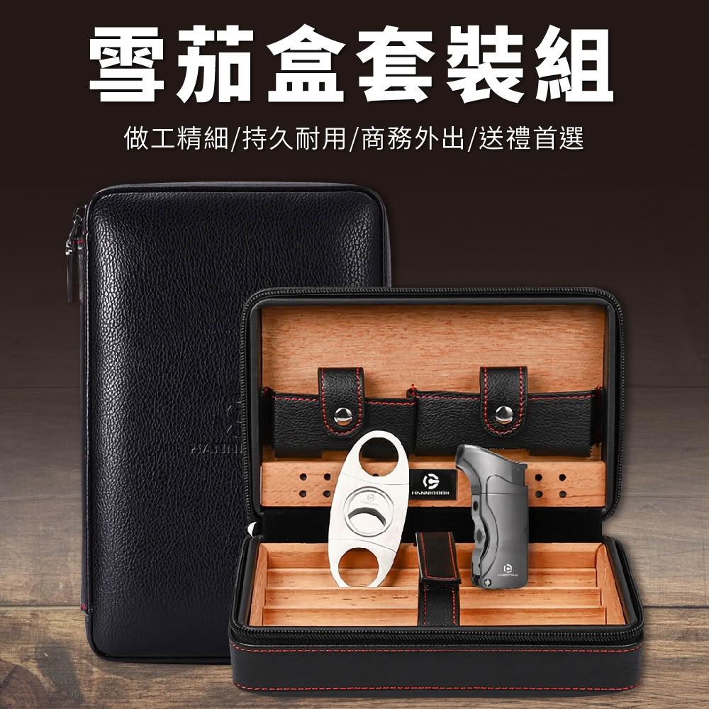 真皮雪松木雪茄保濕收納盒 雪茄盒 雪茄剪 打火機 交換禮物