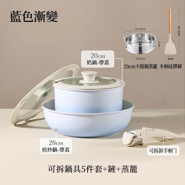 可拆卸鍋具5件套 家用不粘锅 炒锅 可拆卸手柄锅 锅具套装 奶鍋 煎炒鍋(疊加收納/卡扣拆卸/不挑爐具/可進烤箱)