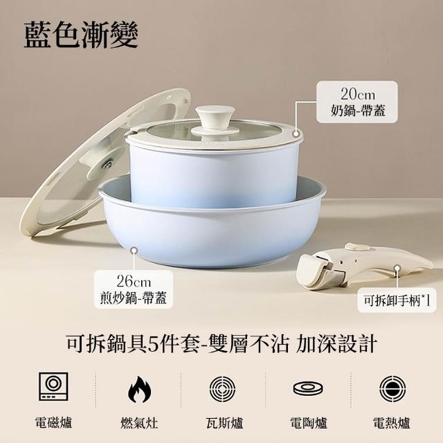 可拆卸鍋具5件套 家用不粘锅 炒锅 可拆卸手柄锅 锅具套装 奶鍋 煎炒鍋(疊加收納/卡扣拆卸/不挑爐具/可進烤箱)