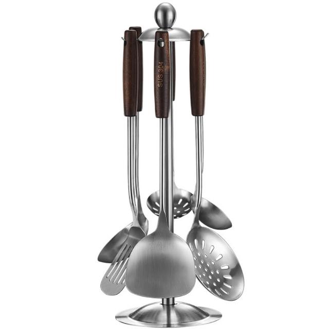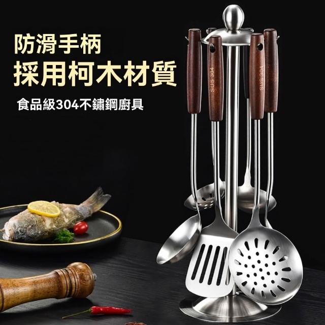 宜品居家304不銹鋼鍋鏟 家用木柄廚具套裝 漏勺鏟子湯勺廚房用具(六件套帶掛架/耐高溫/精細工藝)