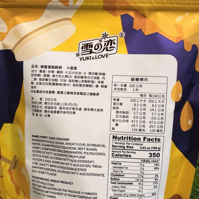 雪之戀 YUKI & LOVE 蜂蜜蛋糕酥餅 100g 蛋糕餅乾 茶點 蛋素