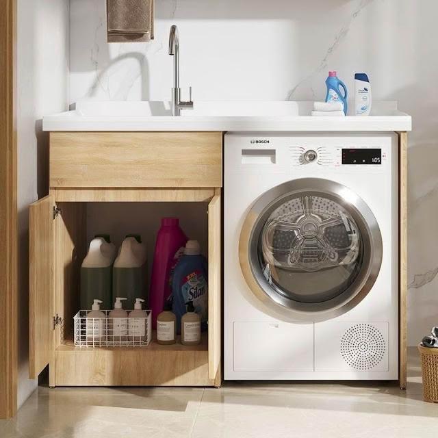 實木洗衣機櫃陽台洗衣槽洗手池檯面一體帶搓板組合滾筒洗衣機伴侶