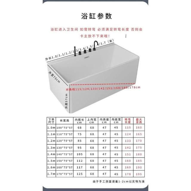 免運 浴缸 獨立浴缸 小戶型加深 無縫一體 成人浴缸 小戶型保溫 浴缸亞克力 方形 獨立式成人家用浴盆日式