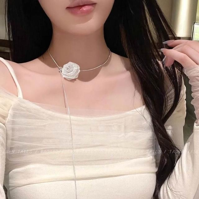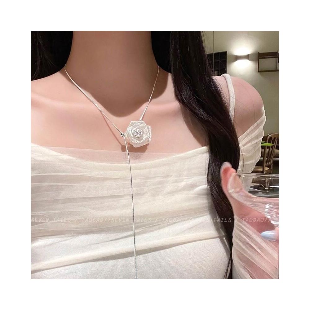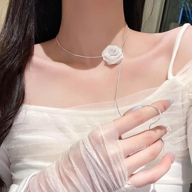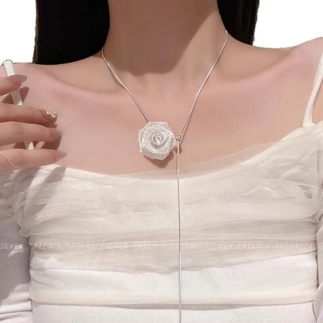 買一送二項鏈超仙網紗玫瑰花項鏈女可抽拉調節鎖骨鏈輕奢頸鏈氣質項鍊毛衣鍊長項鍊短項鏈吊墜項鏈時尚百搭項鍊低調金色銀色女項鍊