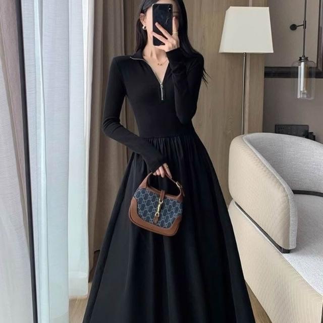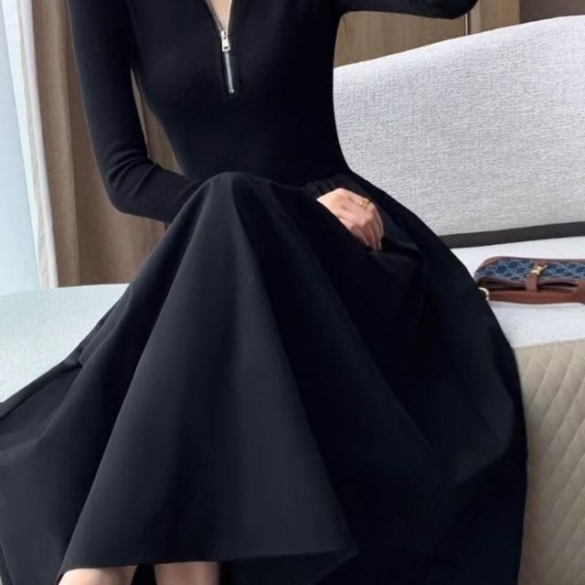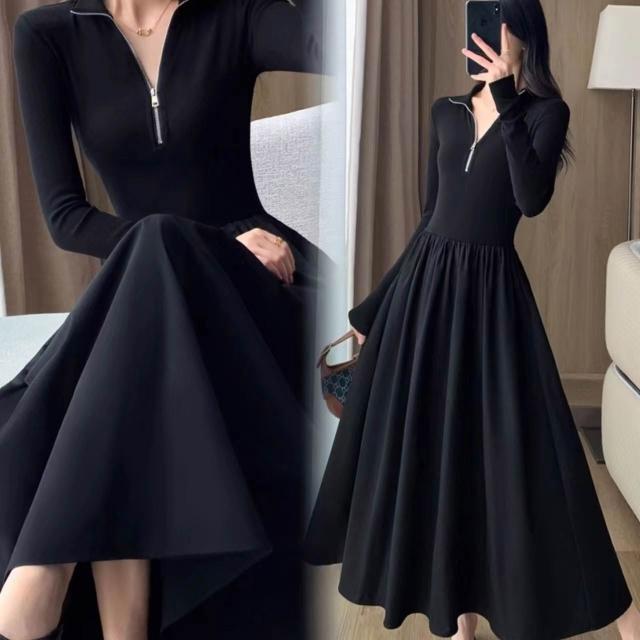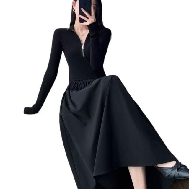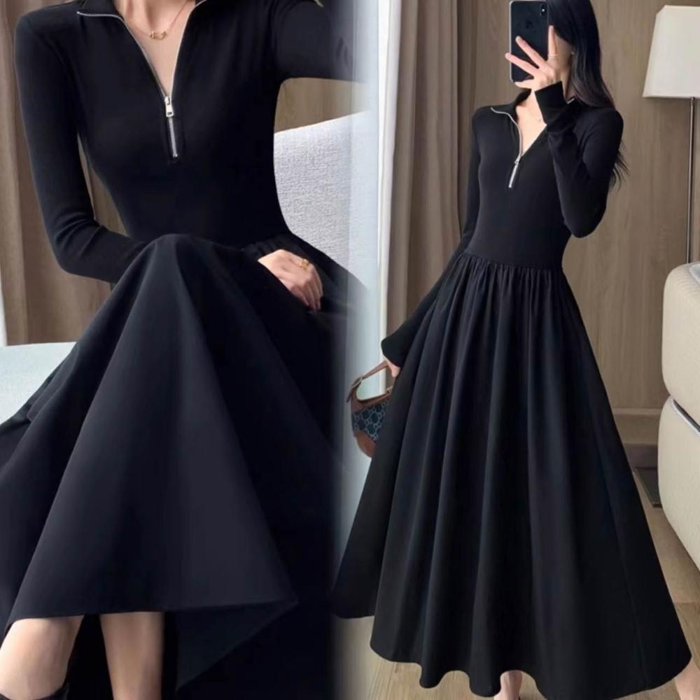 連衣裙女A字收腰顯瘦長裙小眾設計感溫柔風收腰顯瘦長袖連衣裙秋冬新款氣質拉鏈打底裙法式大擺裙連身裙女洋裝裙子黑色高級感長裙