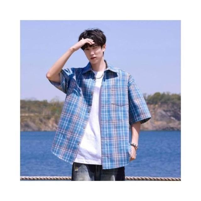 夏季新款 大尺寸格紋 短袖襯衫 輕薄 透氣 薄外套 休閒 工裝外套寸衫 百搭 五分袖 襯衣男 時尚休閒寬鬆外套