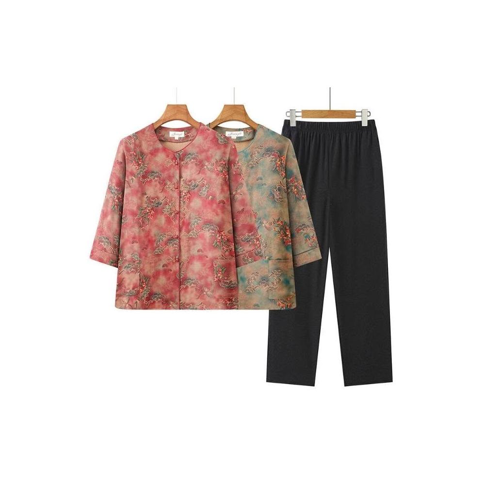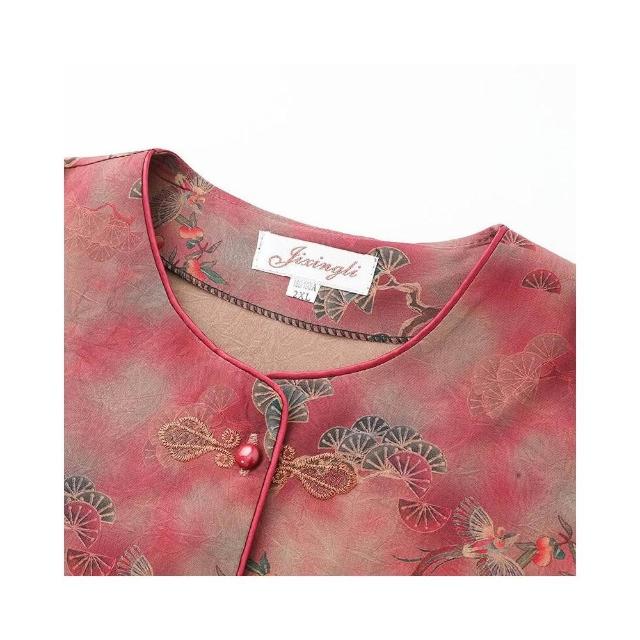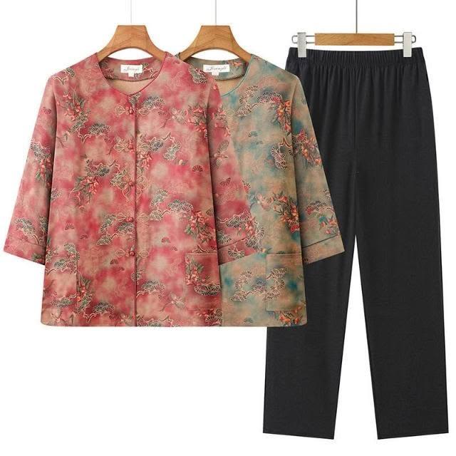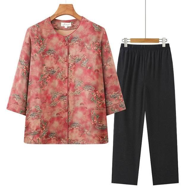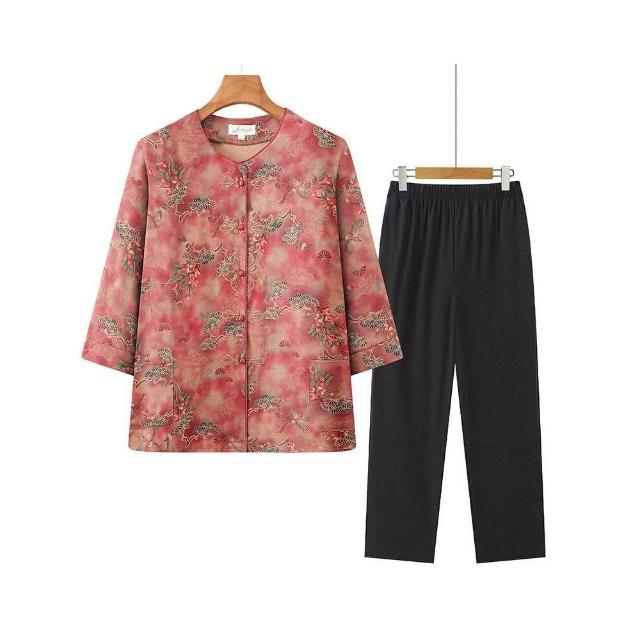 涼感衣套裝冰絲套裝棉麻套裝刺繡盤扣設計透氣涼感夏季中老年休閒兩件式休閑刺繡中國風媽媽裝七分袖碎花兩件套套裝寬鬆不勒抗皺易穿脫日常媽媽裝刺繡套裝中式盤扣速乾套裝