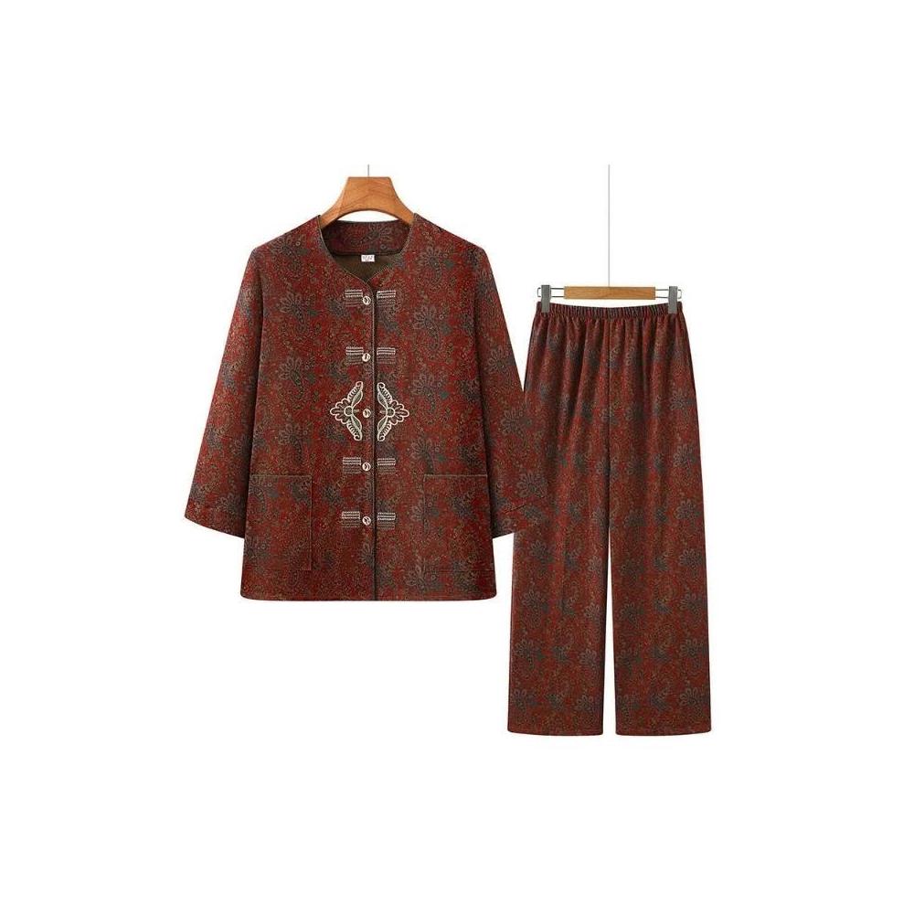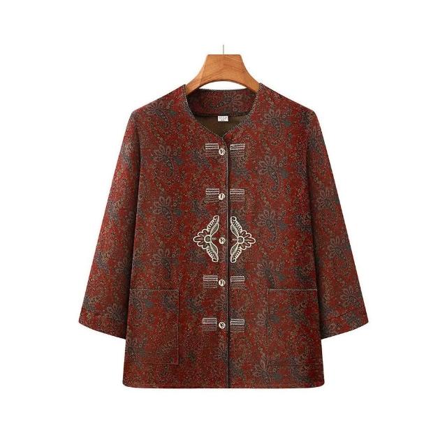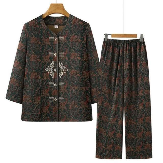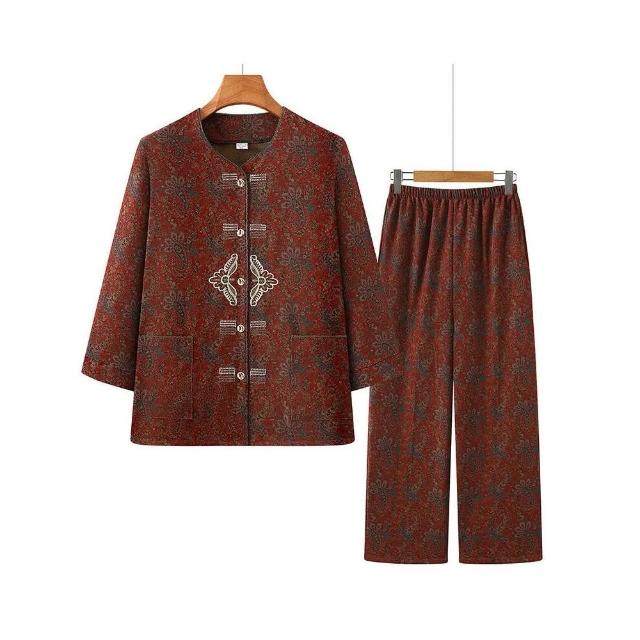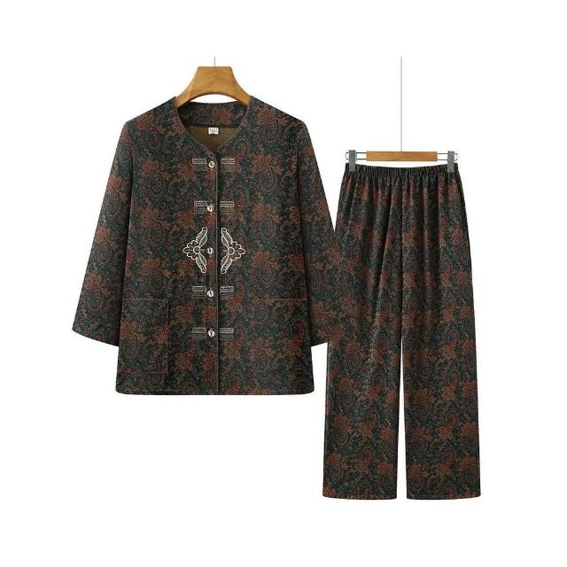 涼感衣套裝冰絲套裝棉麻套裝刺繡盤扣設計透氣涼感夏季中老年休閒兩件式中老年時尚寬松休閑女裝刺繡中國風媽媽裝七分袖碎花兩件套寬鬆不勒抗皺易穿脫日常媽媽裝刺繡套裝中式盤扣速乾套裝