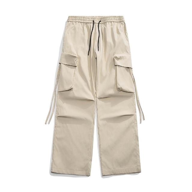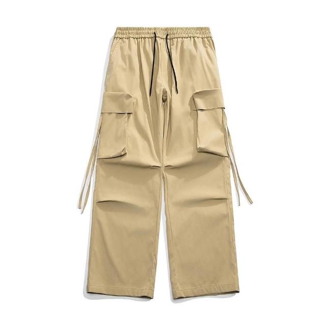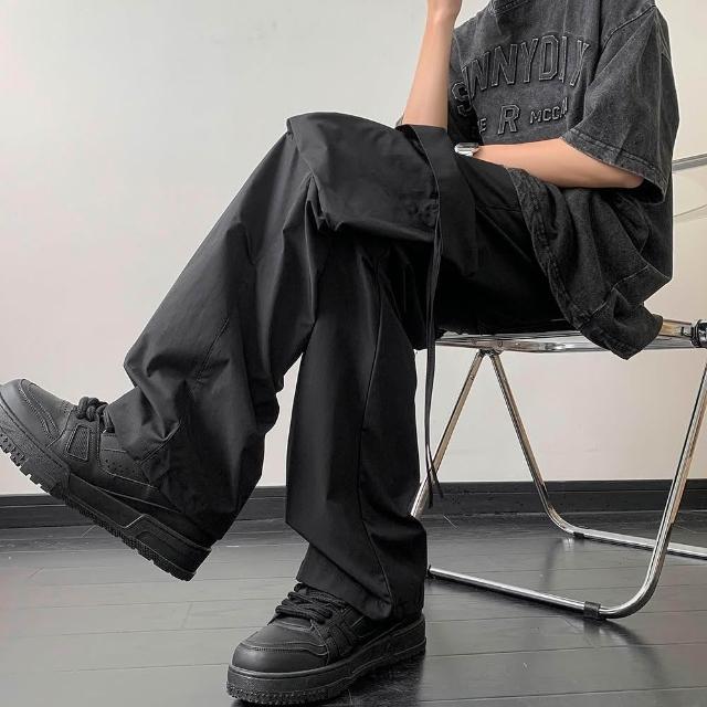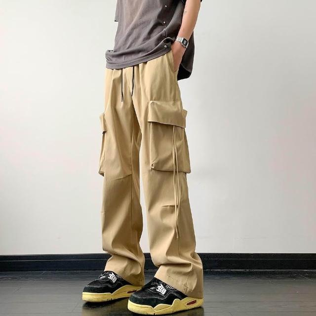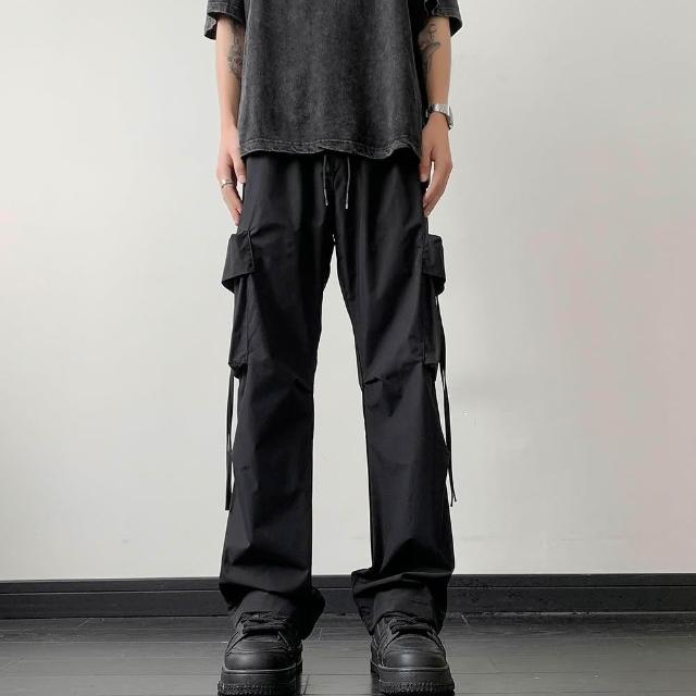 夏季美式高街工裝長褲 寬鬆多口袋彈性休閒時尚長褲 直筒闊腿褲 拖地工作褲 黑色褲子大口袋工裝褲 百搭男女同款
