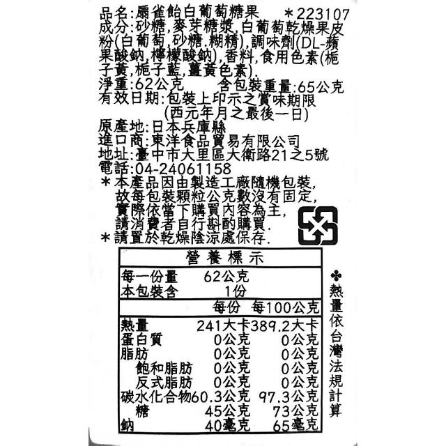 SENJAKU 扇雀飴+爆買日本+ 白葡萄風味糖 65g 硬糖 水果糖 北海道產白葡萄 果皮粉 喜糖 日本原裝進口