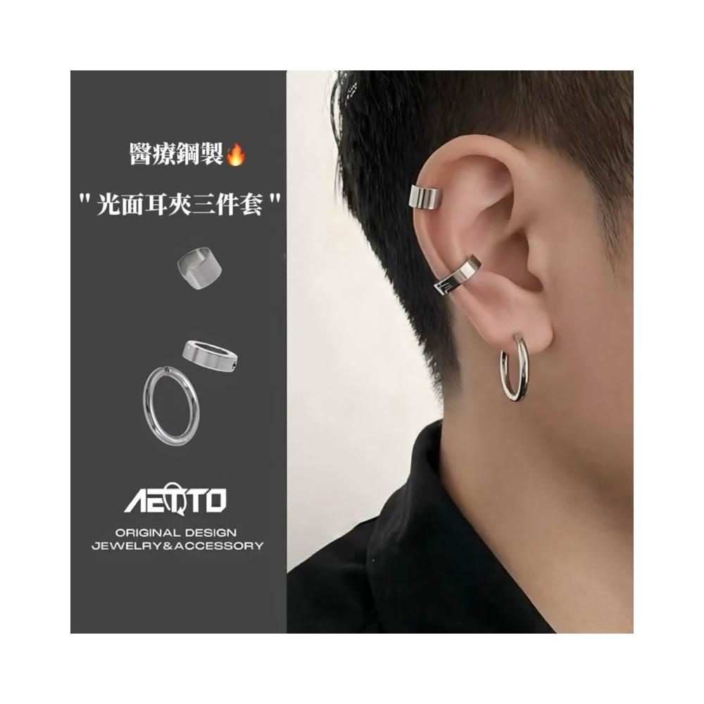 𝑨𝑬𝑻𝑻𝑶 光面耳夾三件套 黑銀兩色 簡約 百搭 醫療鋼 耳環 耳環組 無耳洞可戴 耳夾 耳骨夾 男生耳環 女生耳環