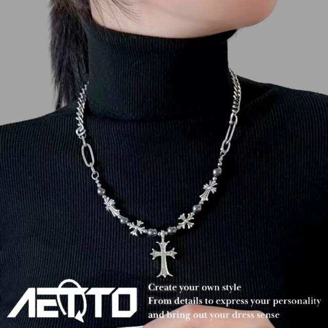 𝑨𝑬𝑻𝑻𝑶 黑銀串珠十字架項鍊 設計款 鑲鑽 黑膽石 復古風 歐美嘻哈 十字架項鍊 男女可戴 鈦鋼項鍊 男生項鍊