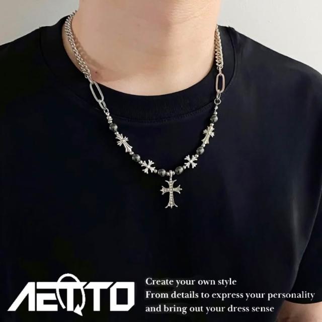 𝑨𝑬𝑻𝑻𝑶 黑銀串珠十字架項鍊 設計款 鑲鑽 黑膽石 復古風 歐美嘻哈 十字架項鍊 男女可戴 鈦鋼項鍊 男生項鍊