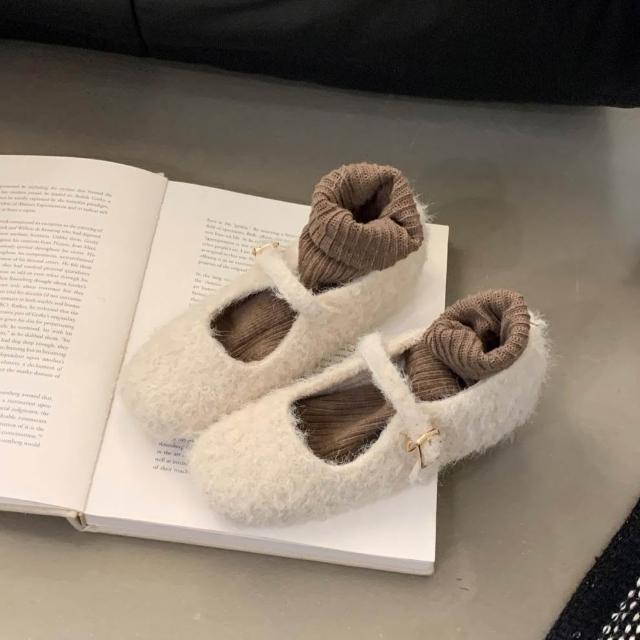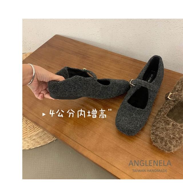 ANGLENELA 🩷小個子 内增高绒面瑪麗珍鞋秋冬新款一字帶羊羔毛毛鞋加絨娃娃鞋☃️❄️