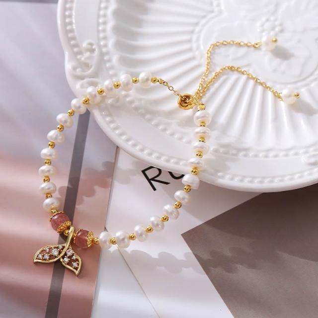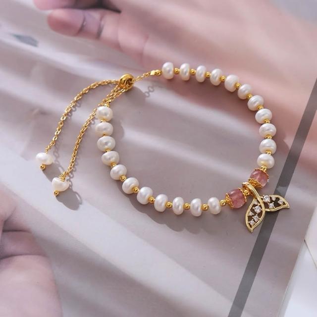 天然珍珠手環 M32 魚尾鑲鑽串珠手鍊 滑扣式 天然水晶珍珠手鍊