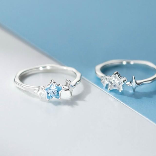 S925純銀 星星戒指 芒星戒指 淡藍鑽/白鑽 抗敏可調節開口戒 不規則戒環設計 Sweet Air M4923