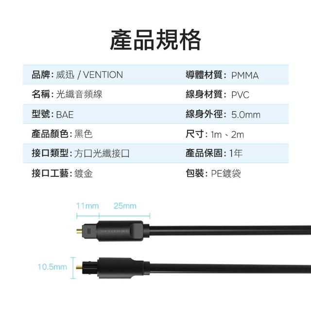 VENTION 威迅 光纖音源線 Toslink S/PDIF OPTICAL音頻線 1公尺 2公尺