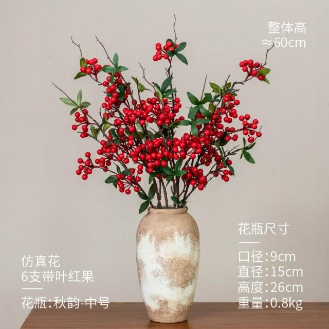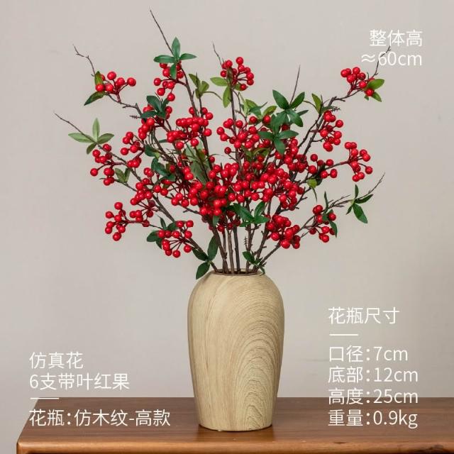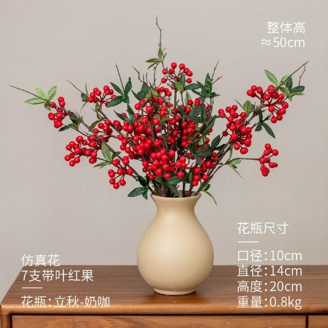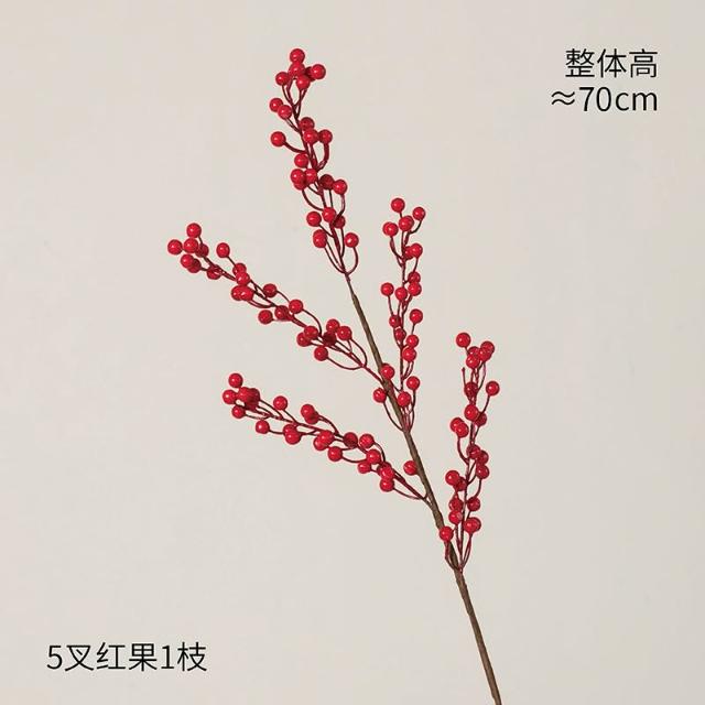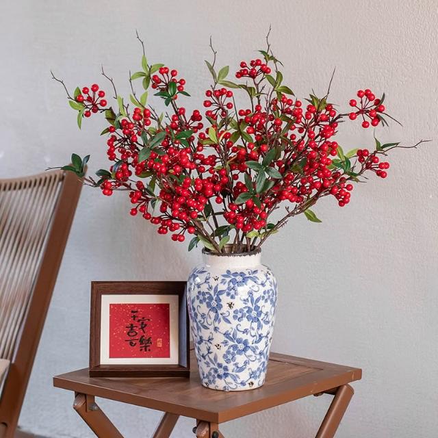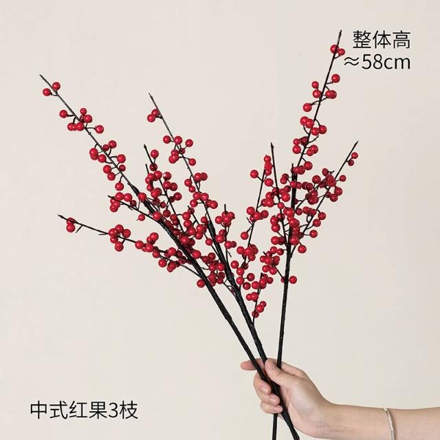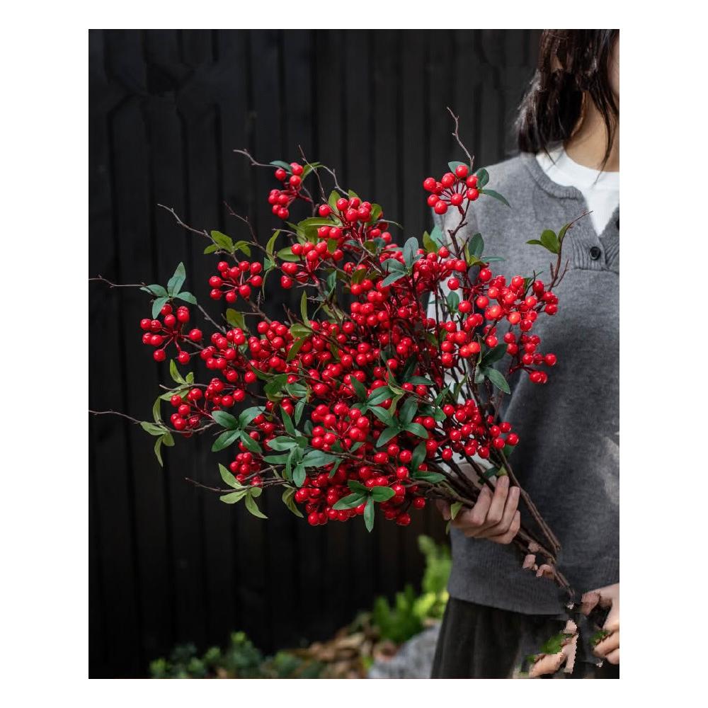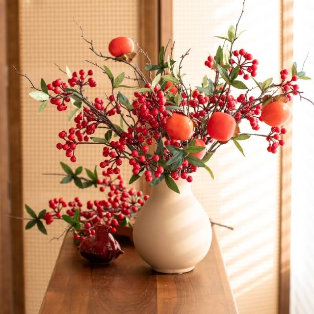 桃甜也居家生活 帶葉紅果發財果仿真花擺件冬青漿果樹枝客廳假花擺設乾燥花