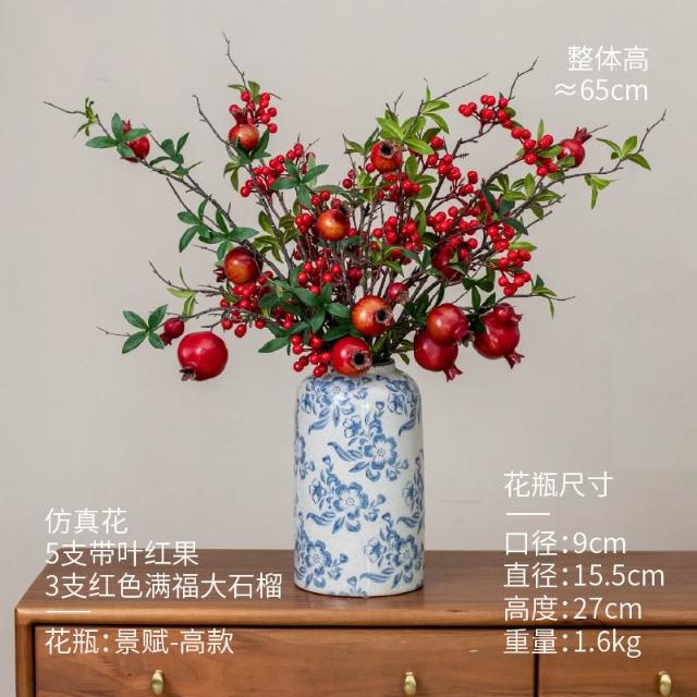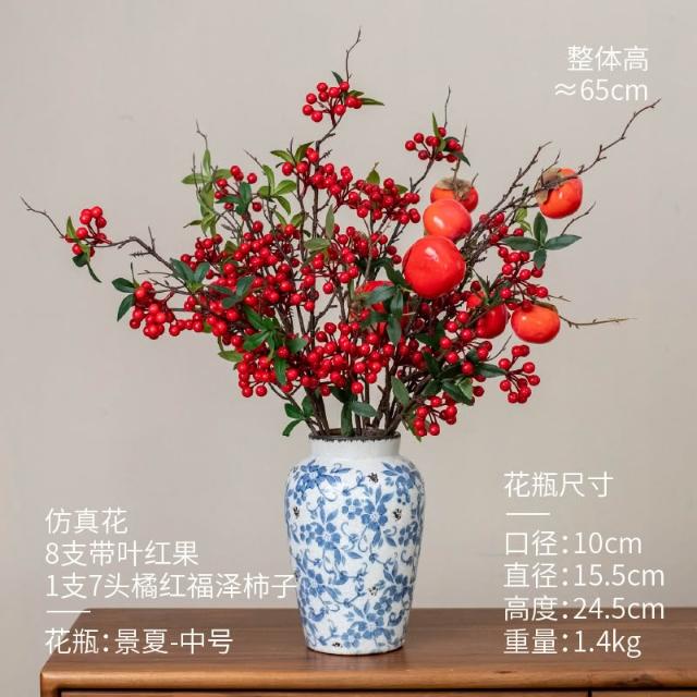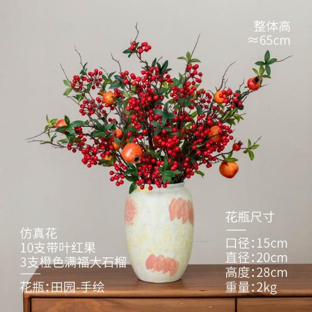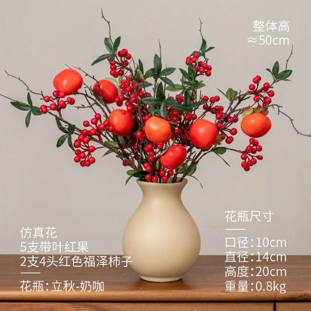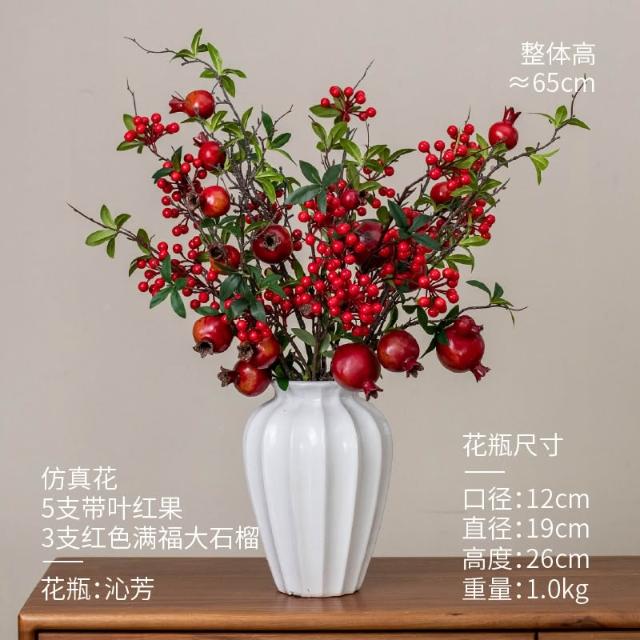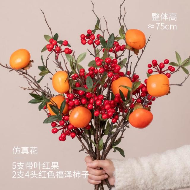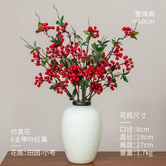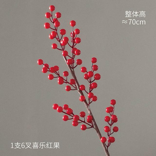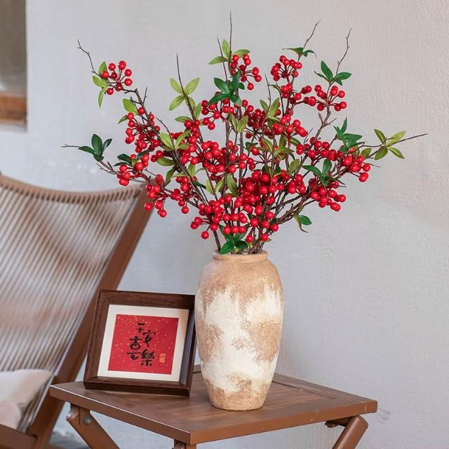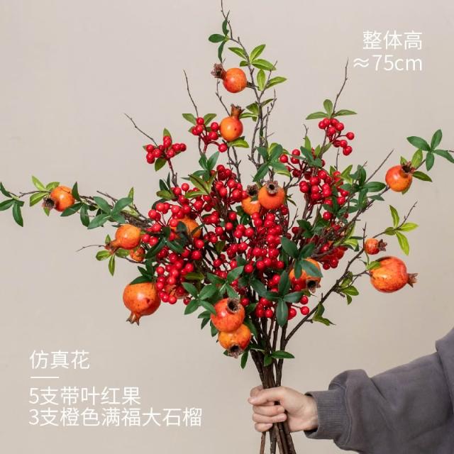 桃甜也居家生活 帶葉紅果發財果仿真花擺件冬青漿果樹枝客廳假花擺設乾燥花