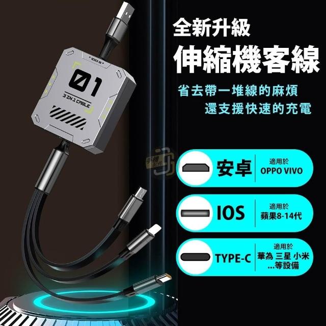 JS購物 100W機客一拖三伸縮快充線 type c 充電線 6A 三合一數據線 快充線 一拖三數據線 車載多功能充電