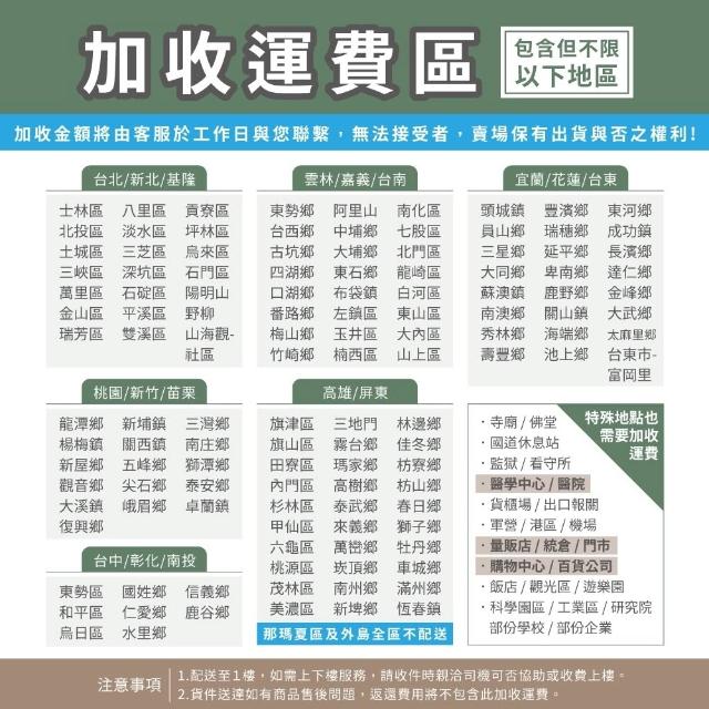 - 針對大型商品(包括:大型家電、家具床墊、健身按摩器材、車類...等),商店將於完成收款確認後,一天內〈不含例假日〉將會有專人與您確認相關配送細節等的聯繫。偏遠地區、樓層費及其它加價費用,皆由商店於約定配送時一併告知,商店將保留出貨與否的權利。