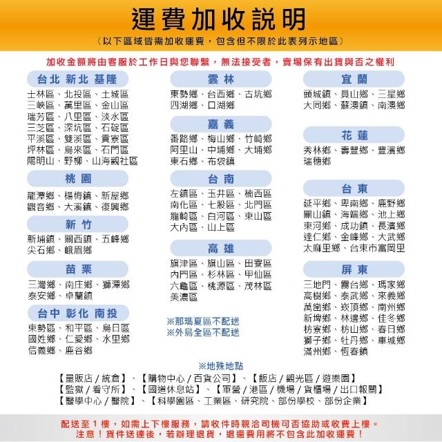 - 針對大型商品(包括:大型家電、家具床墊、健身按摩器材、車類...等),商店將於完成收款確認後,一天內〈不含例假日〉將會有專人與您確認相關配送細節等的聯繫。偏遠地區、樓層費及其它加價費用,皆由商店於約定配送時一併告知,商店將保留出貨與否的權利。