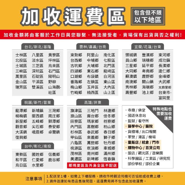- 針對大型商品(包括:大型家電、家具床墊、健身按摩器材、車類...等),商店將於完成收款確認後,一天內〈不含例假日〉將會有專人與您確認相關配送細節等的聯繫。偏遠地區、樓層費及其它加價費用,皆由商店於約定配送時一併告知,商店將保留出貨與否的權利。